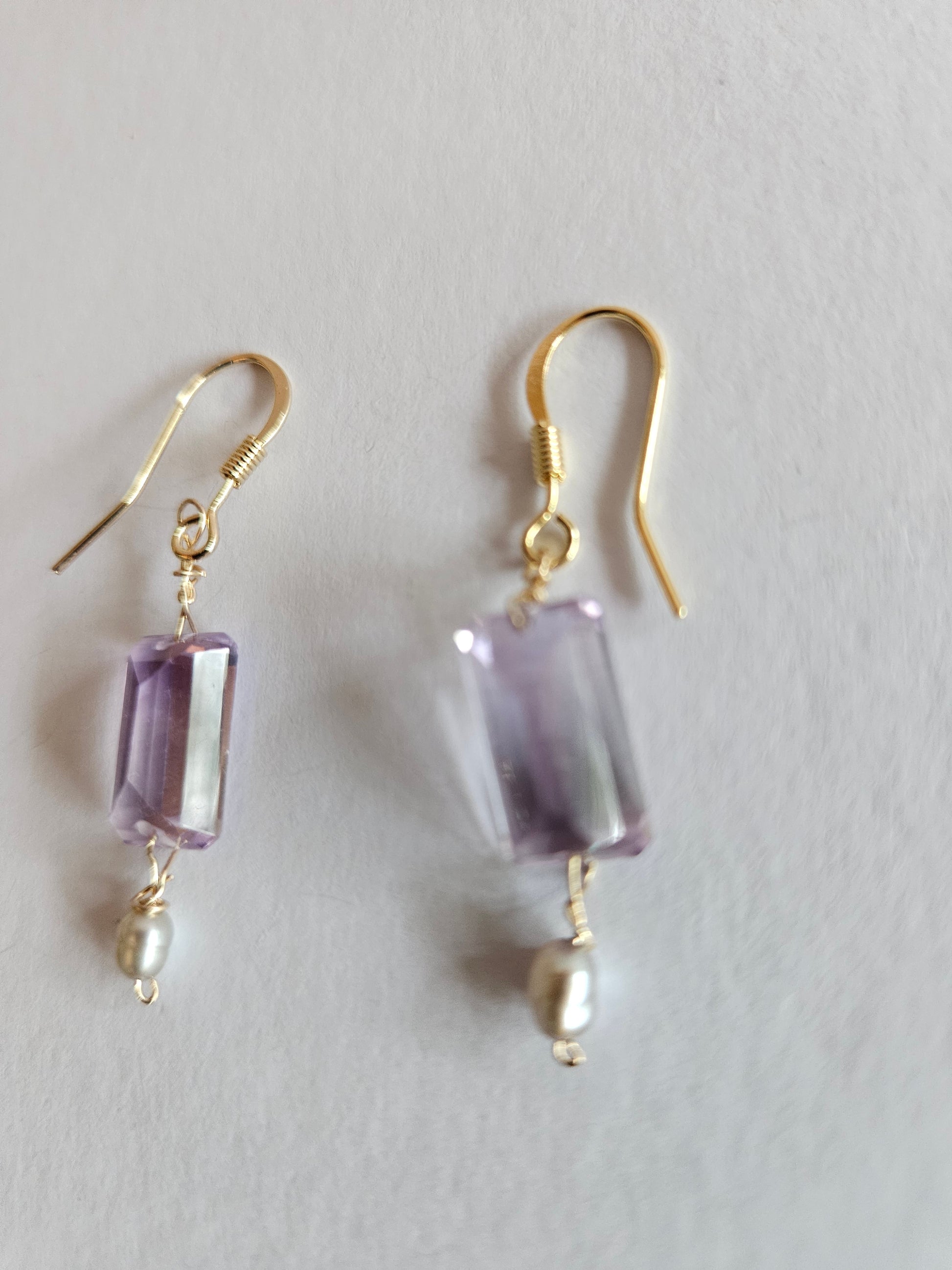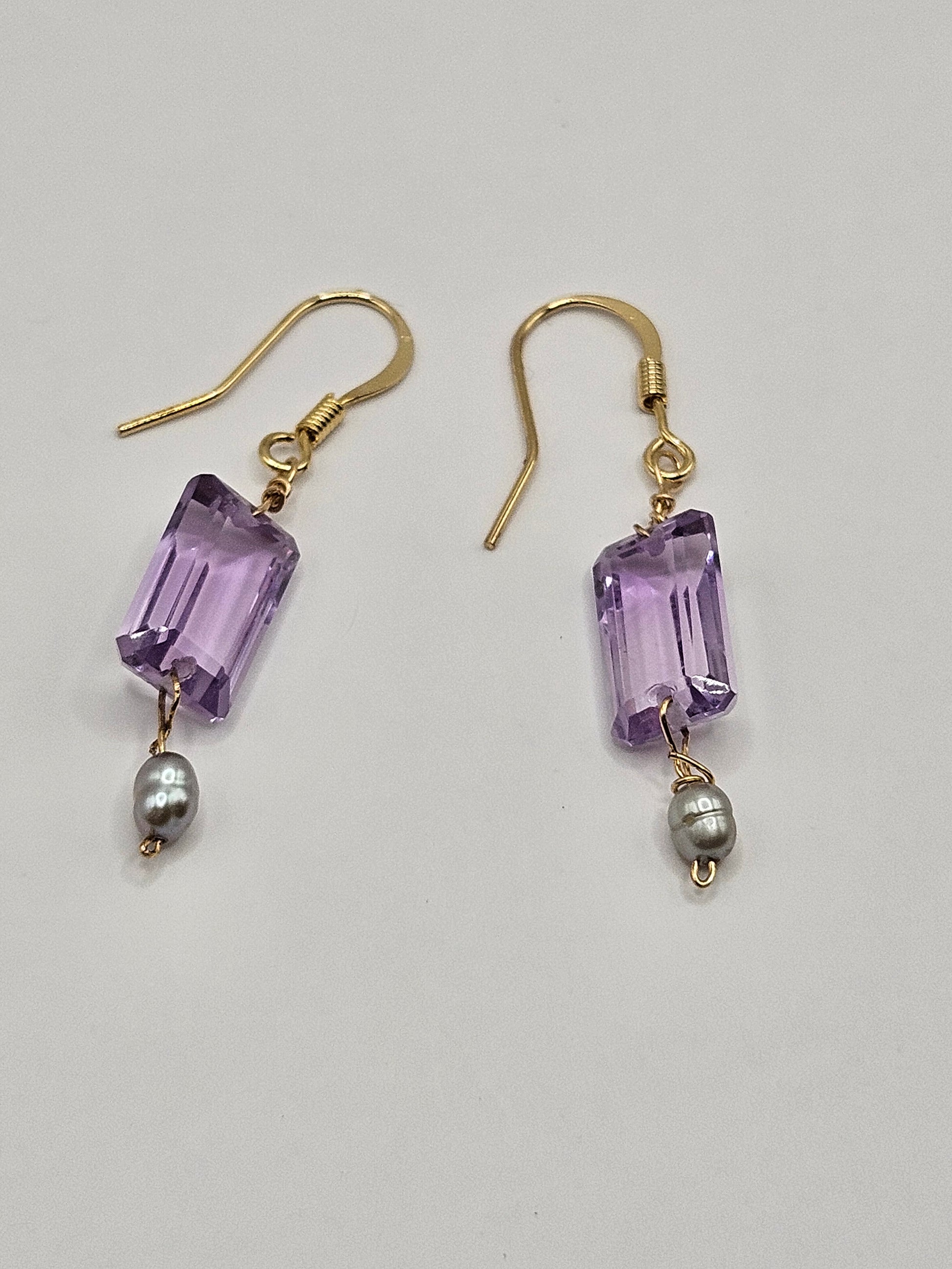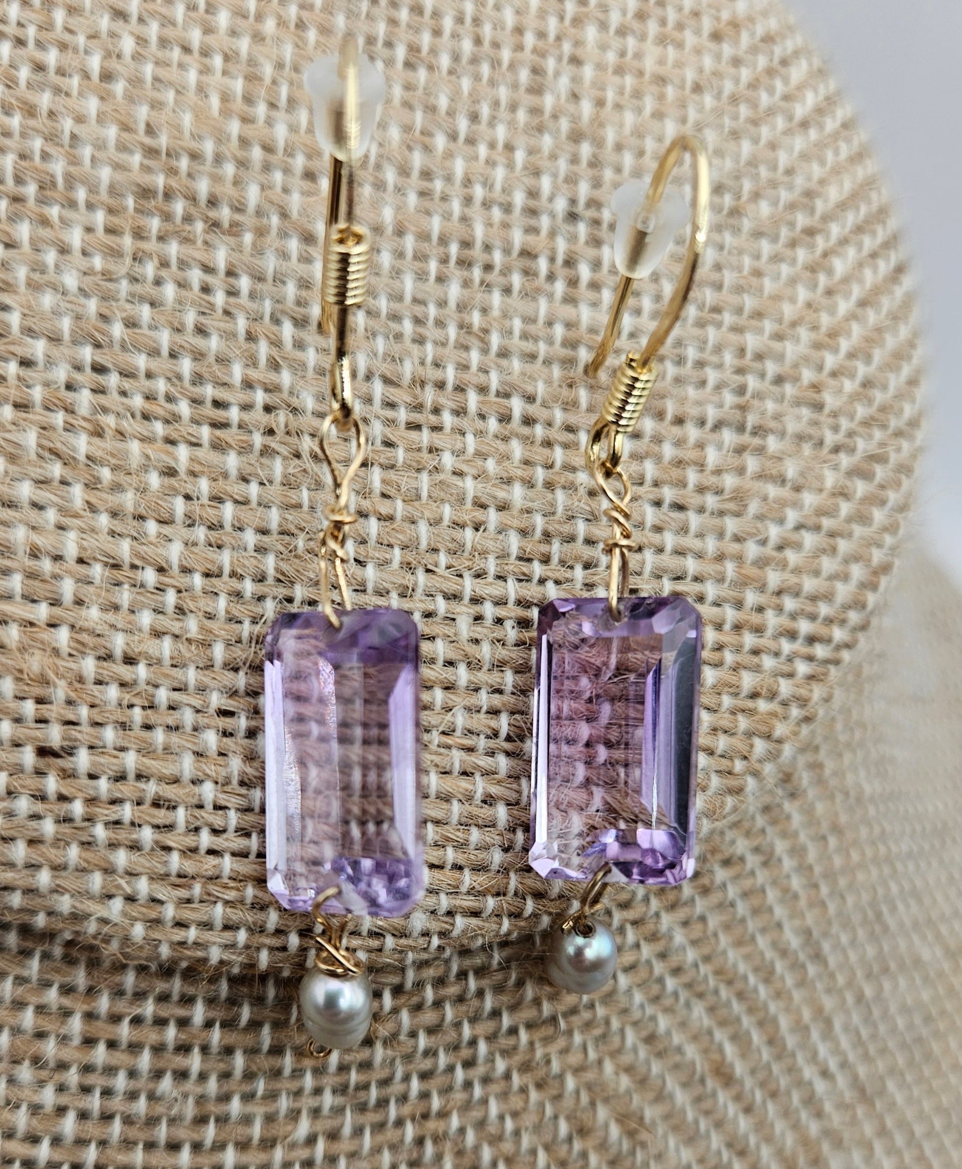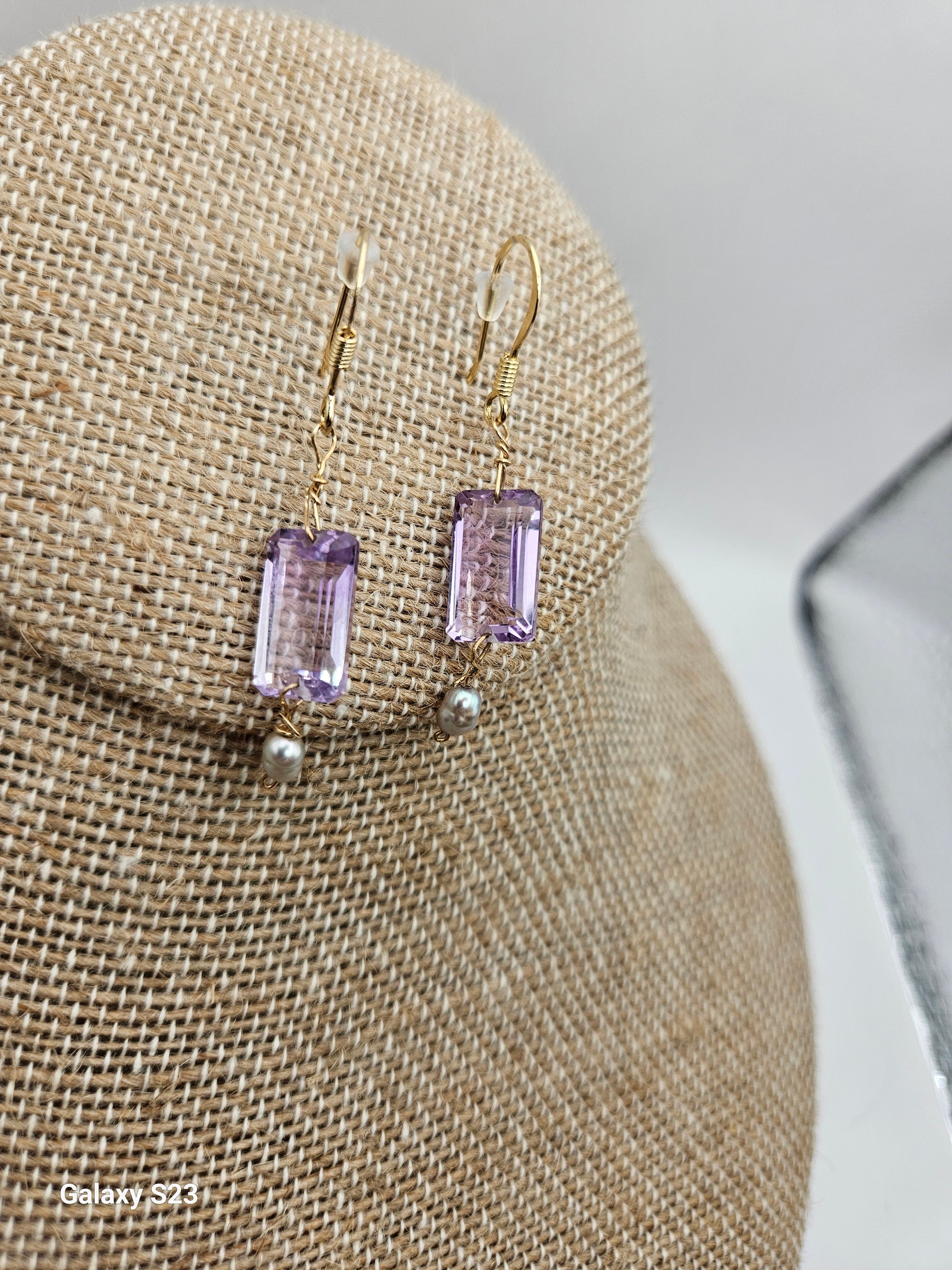 Genuine faceted, face cut rectangular amethyst, 4x2mm white freshwater rice shaped pearl beads on 14k gold filled earring and findings; sterling silver is also available, please message me.