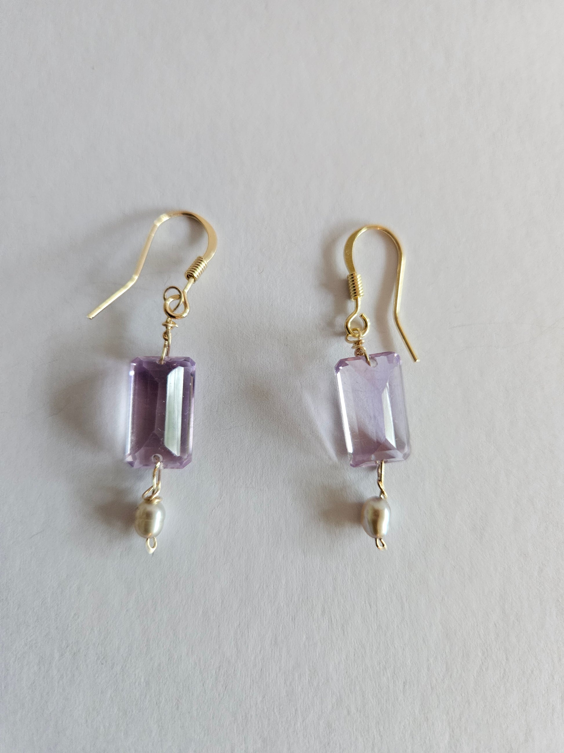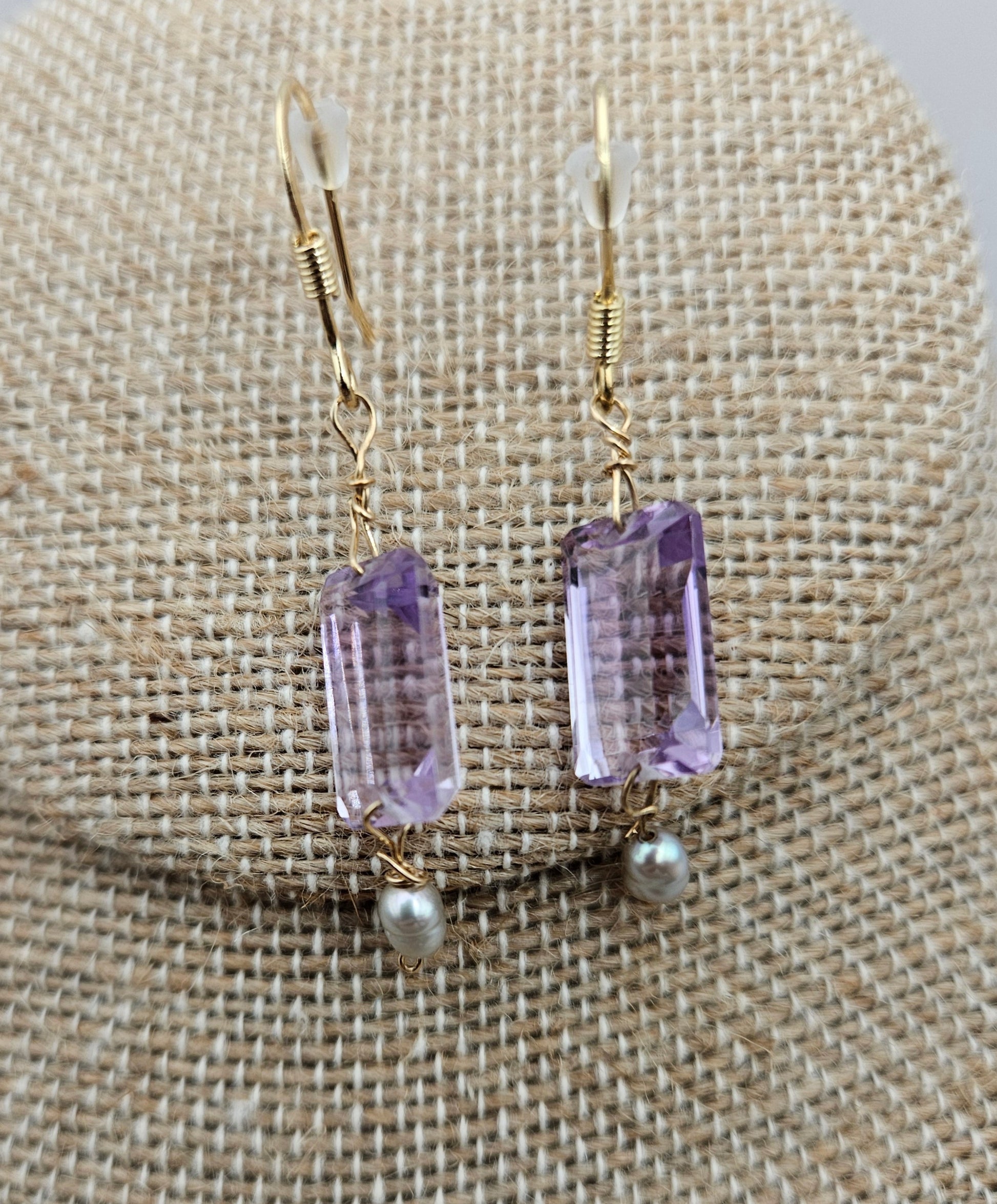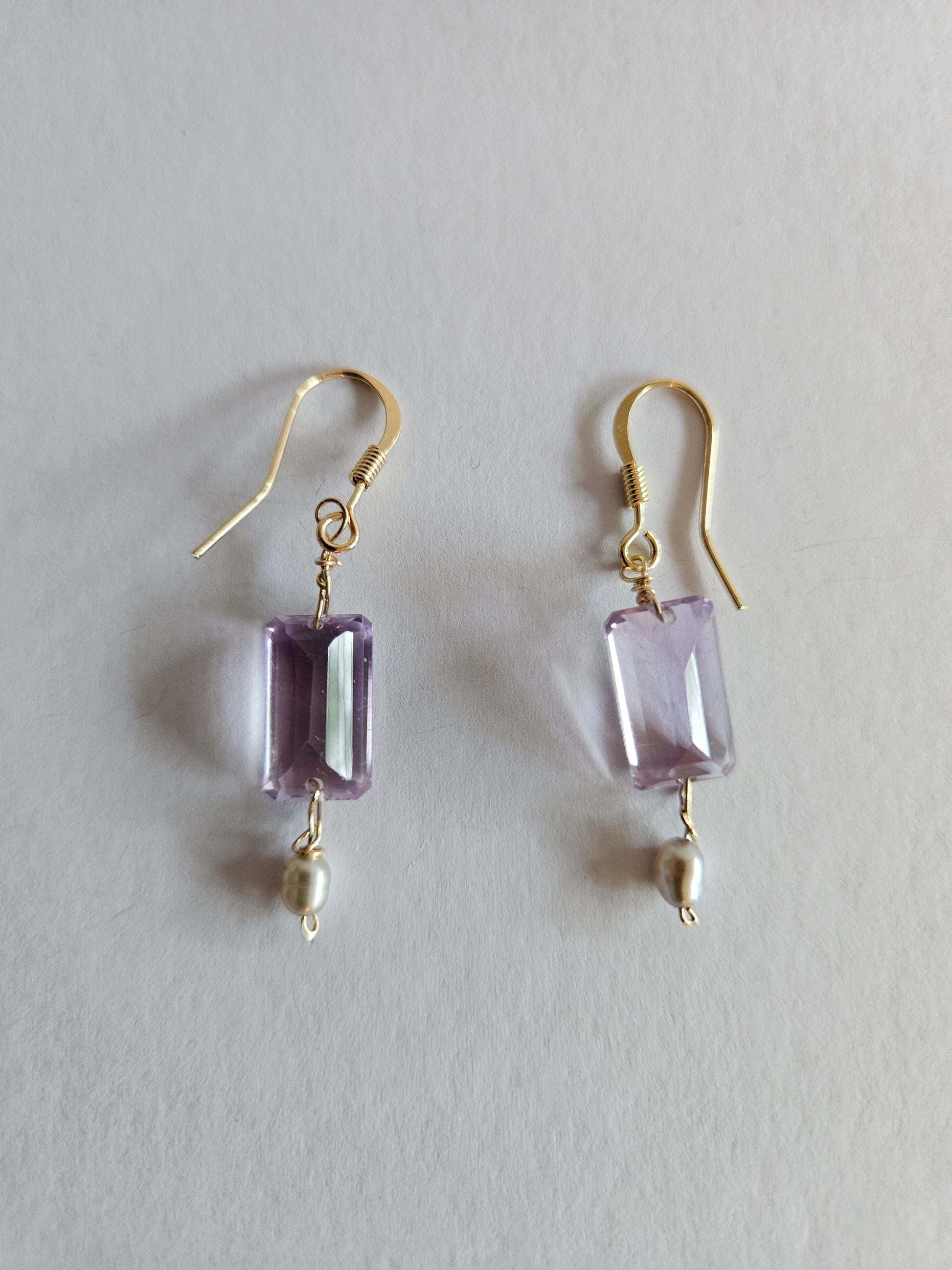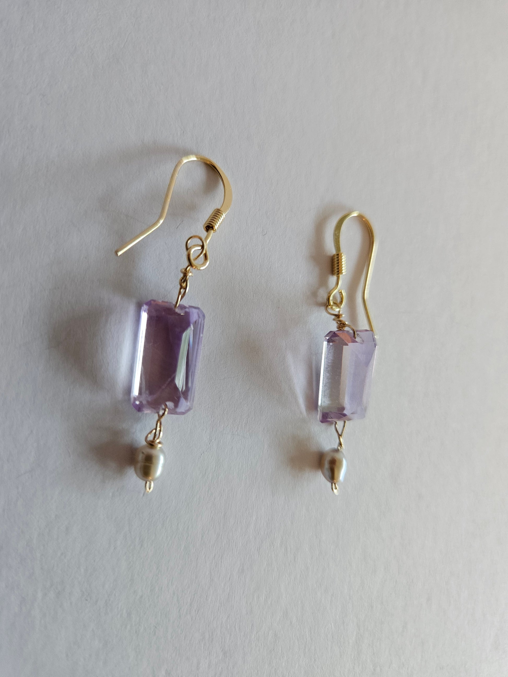 Genuine faceted, face cut rectangular amethyst, 4x2mm white freshwater rice shaped pearl beads on 14k gold filled earring and findings; sterling silver is also available, please message me.