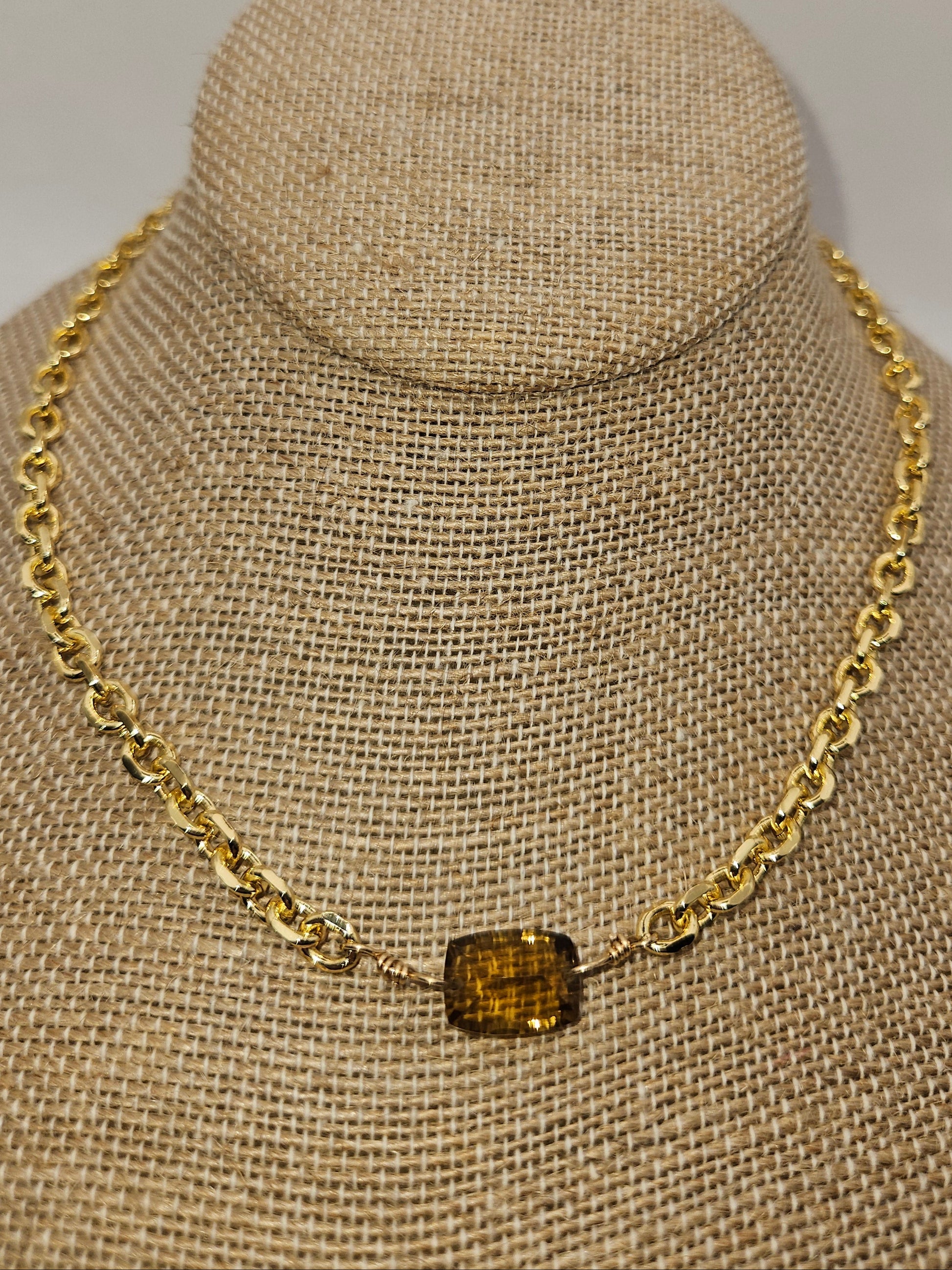 Cognac color citrine face cut large stone is the center of this beautiful chunky chain 14k gold filled necklace. Chain is not heavy, or too large allowing for wear by anyone daily or special occasion.