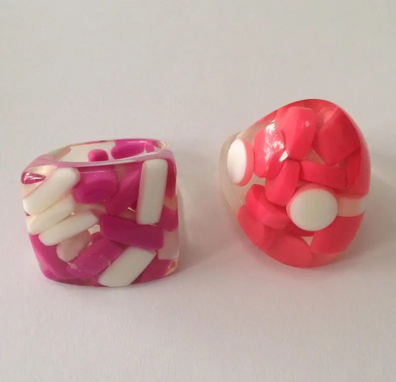 Lucite clear with included pill shaped white and pink shapes set inside Lucite. Oval Dome ring.