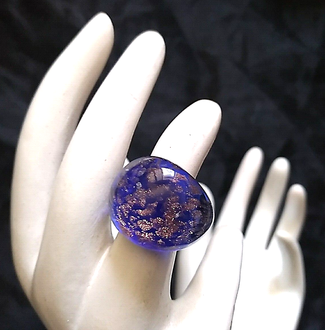 Vintage deep royal blue with gold chunky glitter flecks set in Lucite. Open back, Lucite so not adjustable.